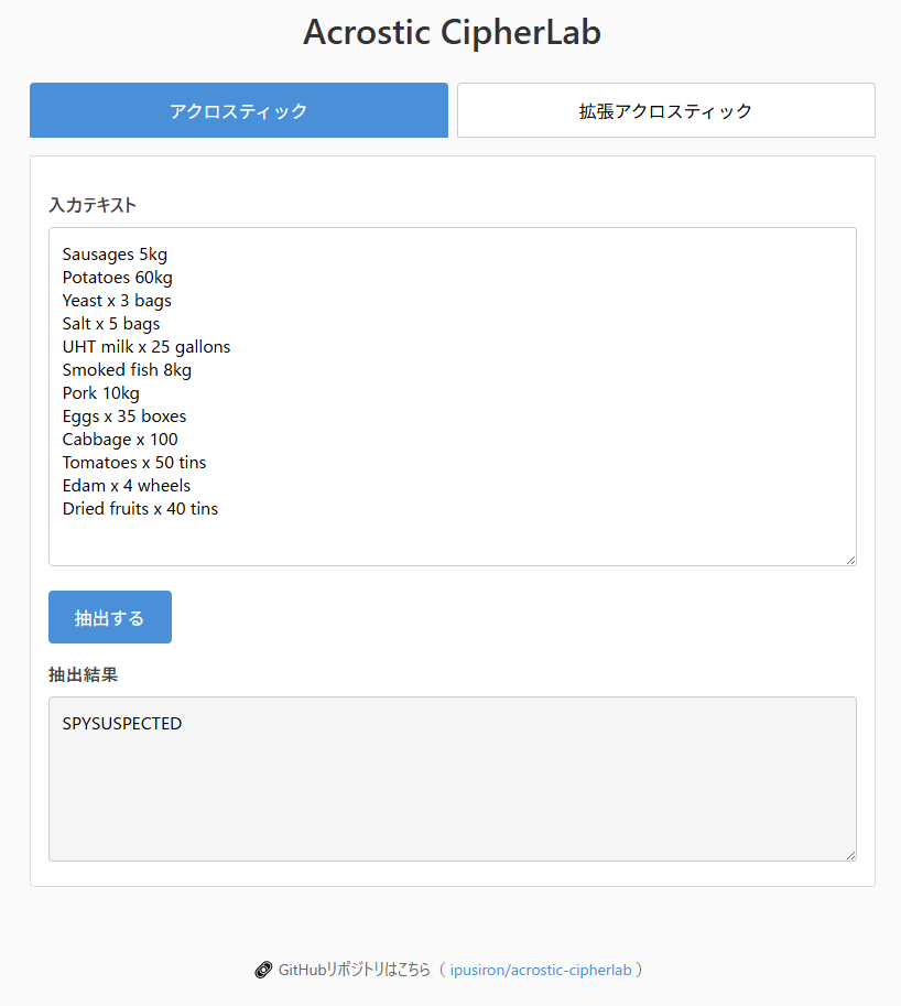 Acrostic CipherLabを使えば、文頭を抽出してくれる見やすく並べてくれます。