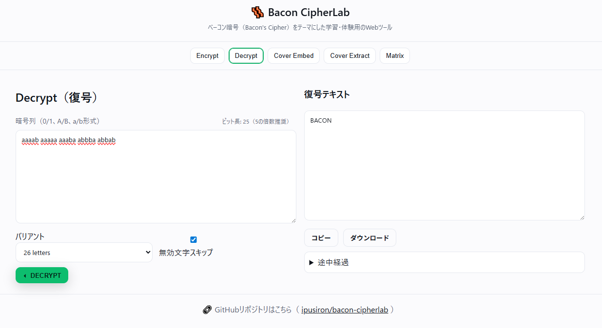 Bacon CipherLabの「Decrypt」タブにはベーコン暗号文の復号機能があります。