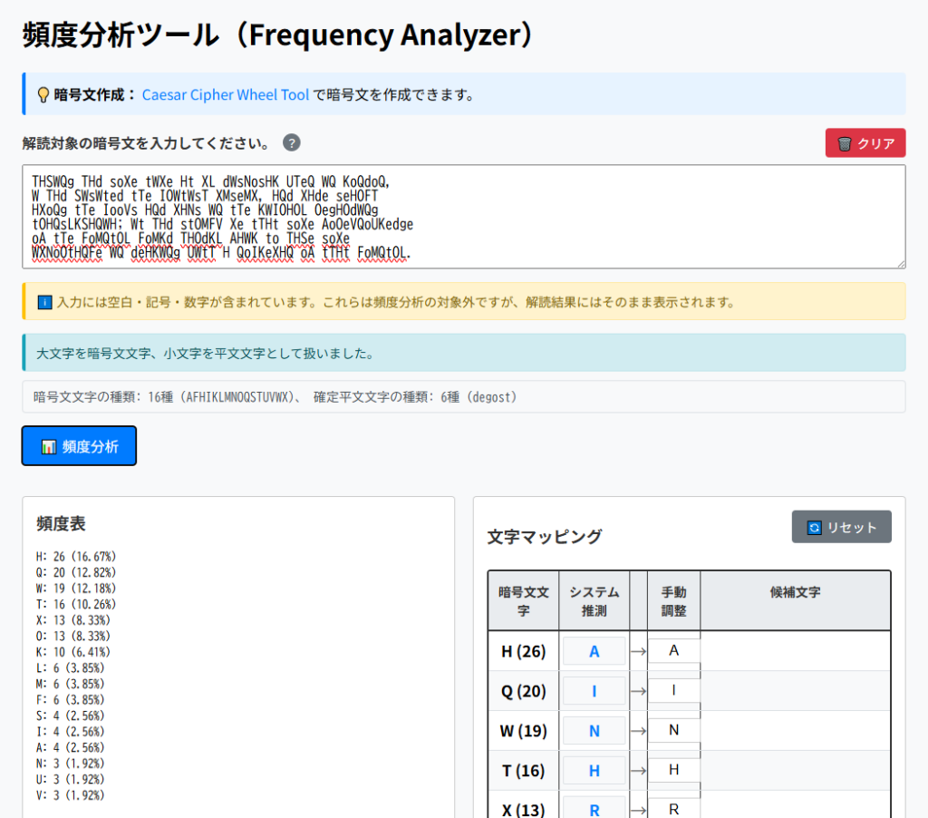 Frequency Analyzerの文字マッピングで「H→A」「W→I」とセットしてみます(「暗号文文字→平文文字」という表記)。