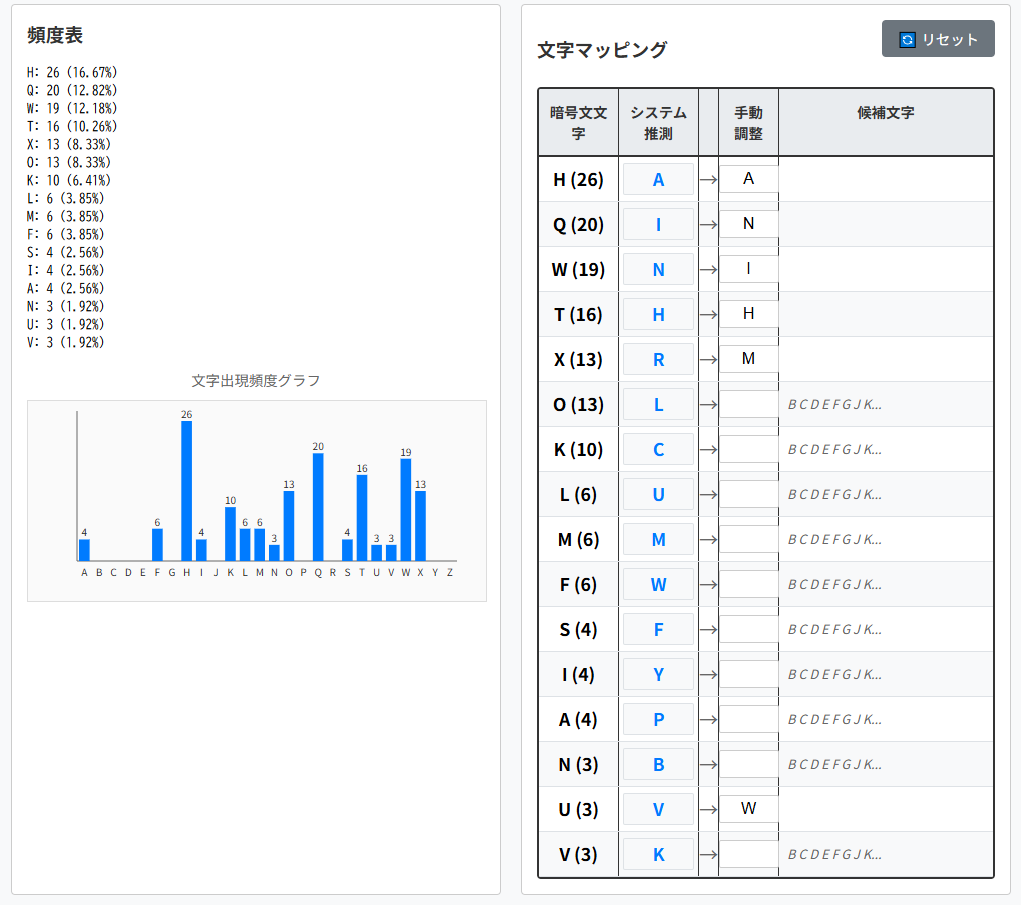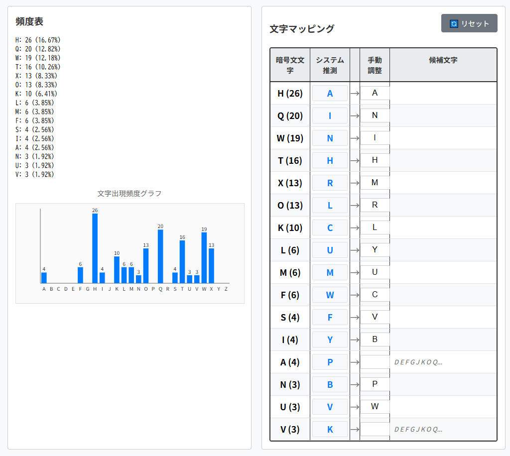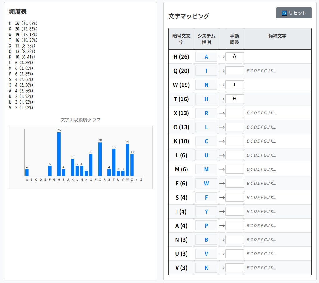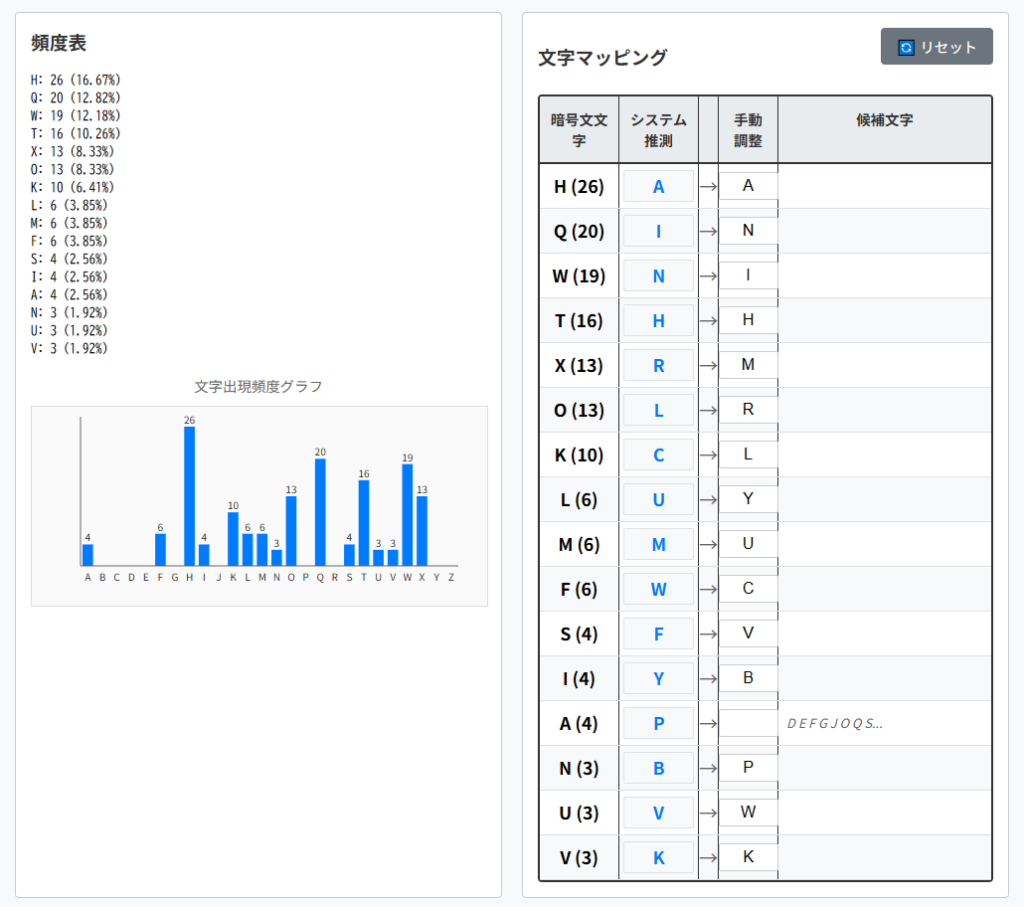 | 暗号文文字(出現回数) | 平文文字の候補1 | 平文文字の候補2 |