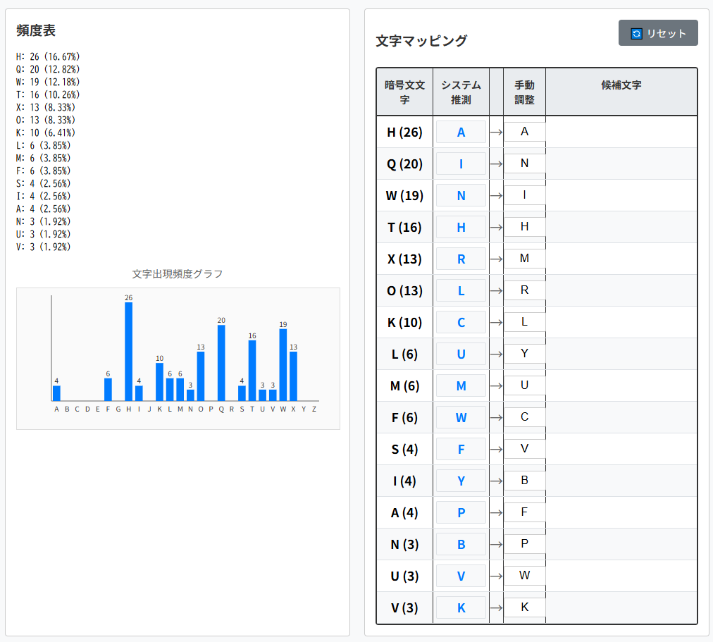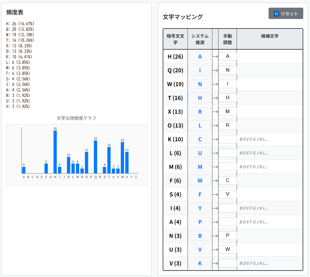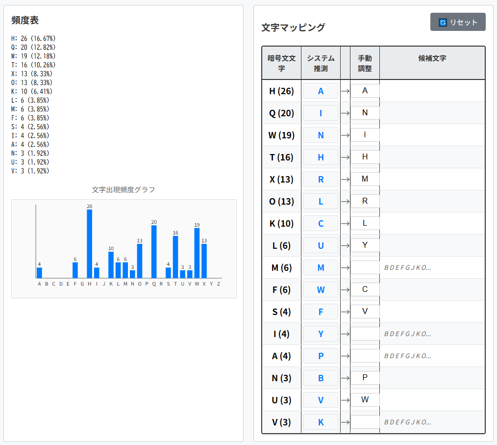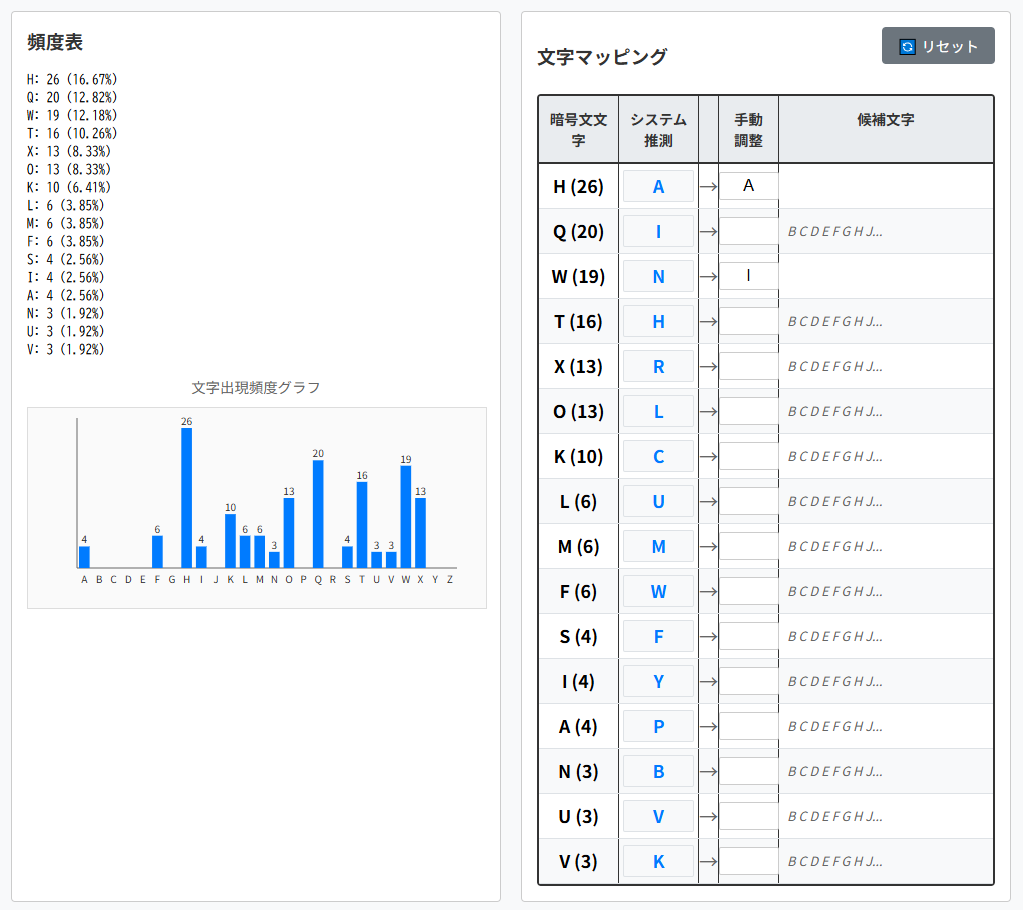 | 暗号文文字(出現回数) | 平文文字の候補1 | 平文文字の候補2 |
