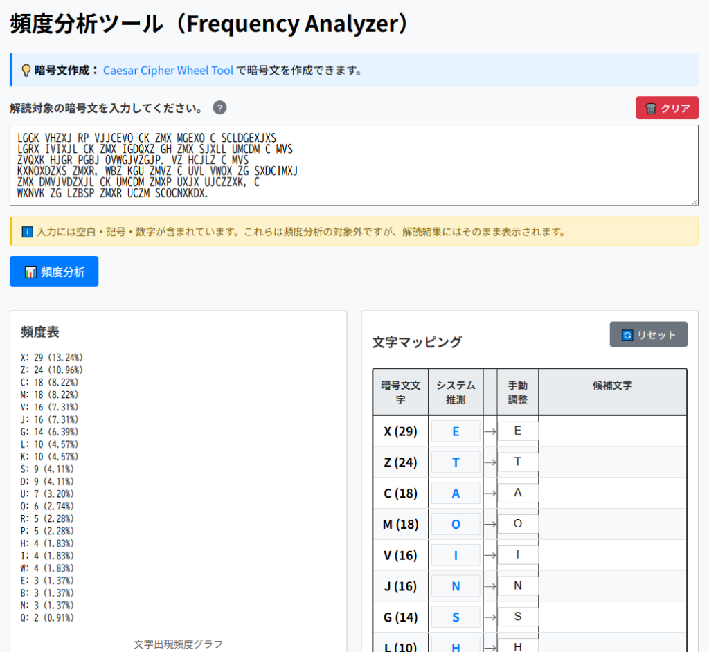 暗号文の下にある表は、頻度表です。