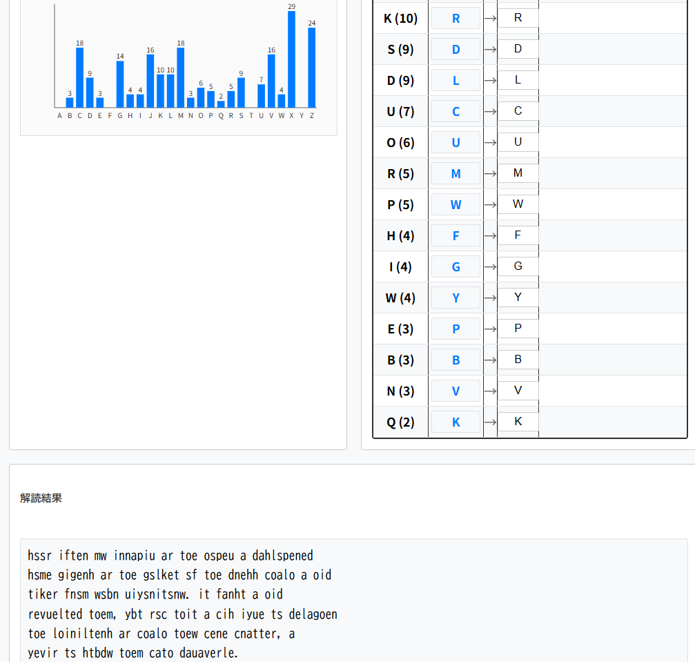 1:頻度分析が有効なので、Frequency Analyzerで解読します。