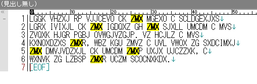 暗号文には"ZMX"という3文字が目立ちます。