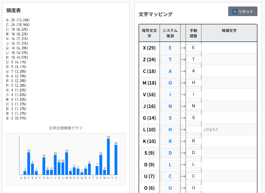 頻度表を見ると最頻の文字は’X’です。しかも29回と、他の文字に比べて極端に出現回数が多いです。一方、英文の最頻文字は’e’です。