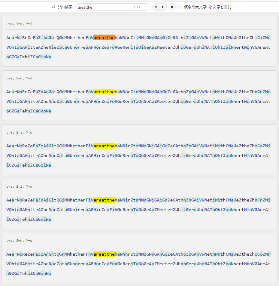 6:’L’⇒’a’のとき、"areatthe"(空白を入れて"are at the")という英文らしい部分が出ています。