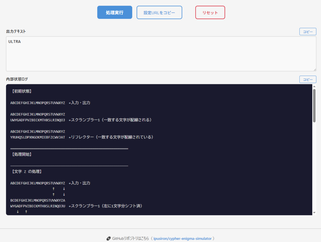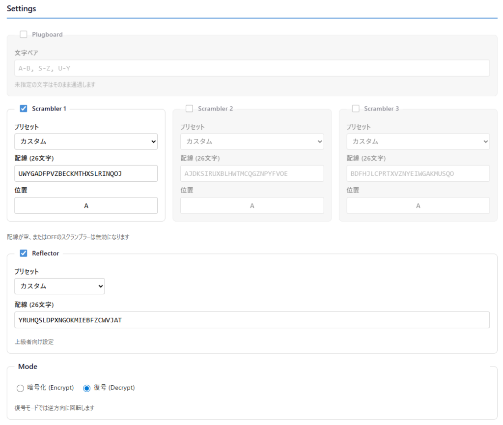 このメッセージは、以下の内部配線を持つ単一のスクランブラーと反射器を使用した試作暗号機で暗号化されました。