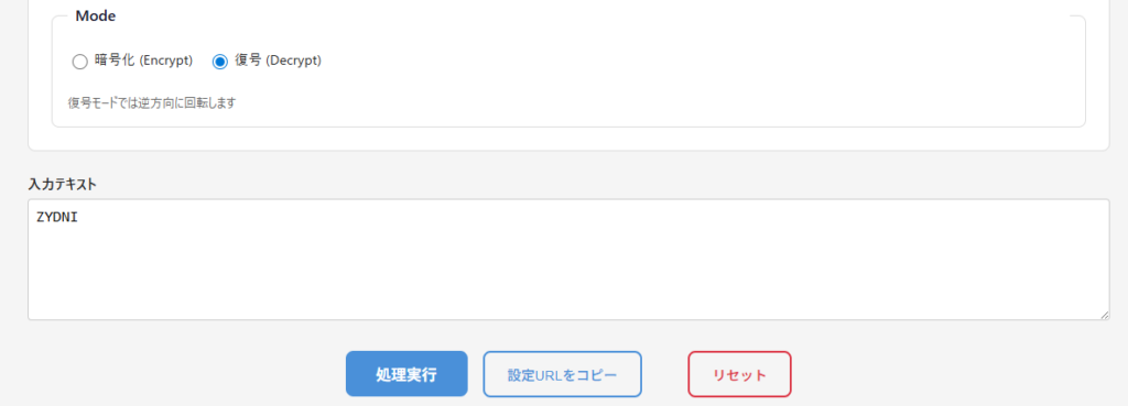 3:入力テキスト欄に暗号文"ZYDNI"を入力します。