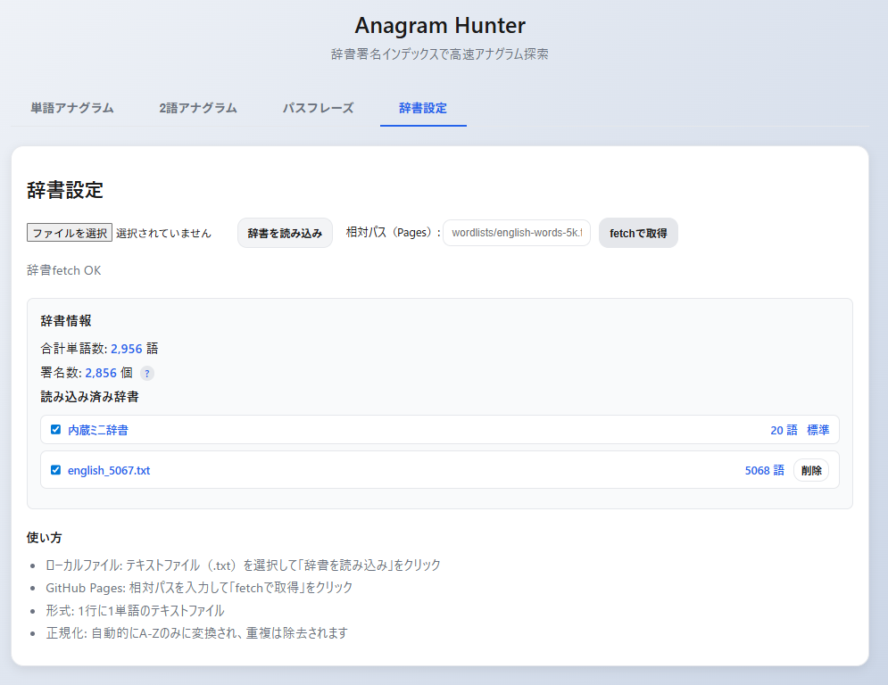 「辞書設定」タブにおいて、相対パスに"wordlists/english-words-5067.txt"を指定して、[fetchで取得]ボタンを押して登録しました。
