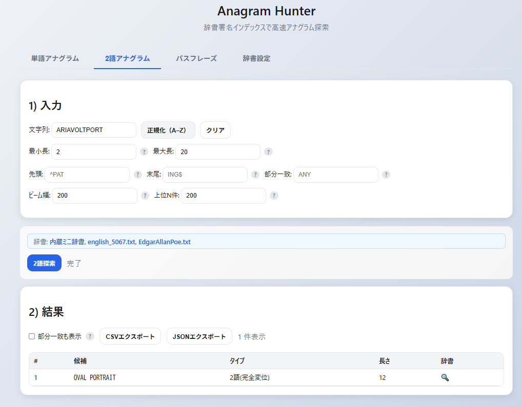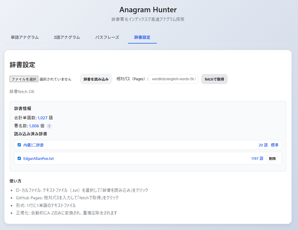 Anagram Hunterで辞書ファイルとして"EdgarAllanPoe.txt"ファイルを読み込みます。