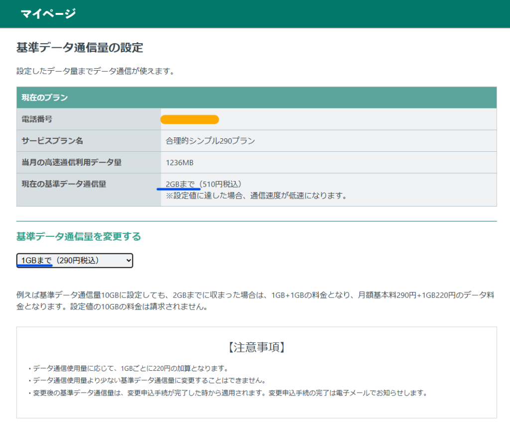 サービス的に翌月になったら、基準データ通信量を「1GB」に戻しておきましょう。