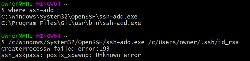 Git BashとWindowsの両方にssh-add.exeが存在するため、どちらを使っているかで挙動が変わります。