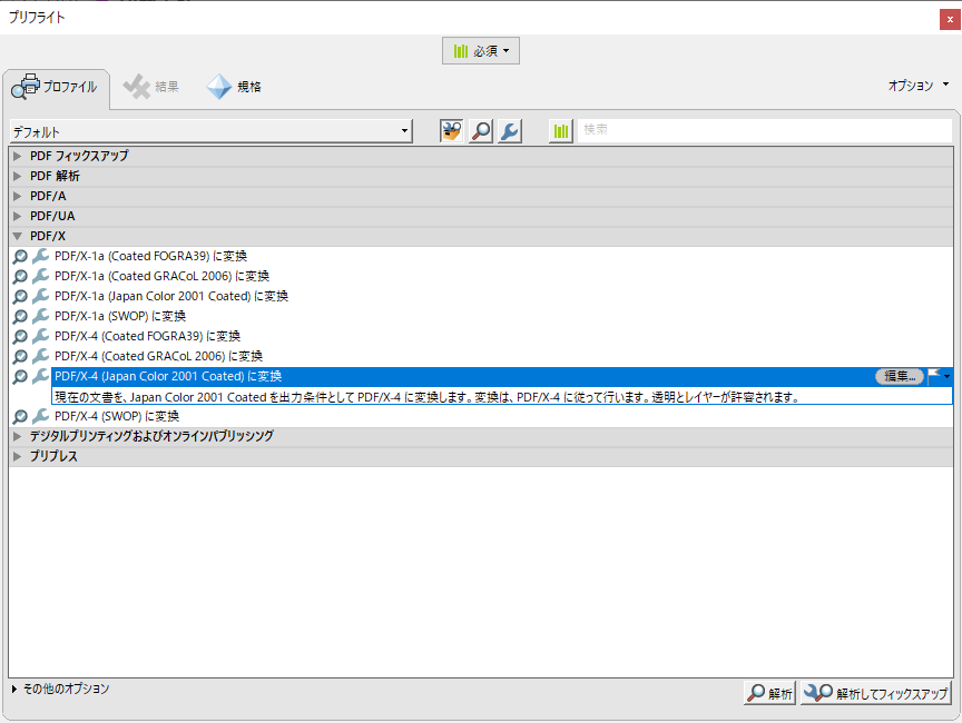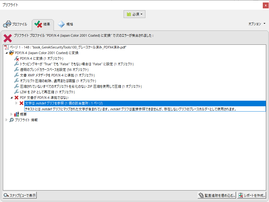 Adobe Acrobat ProのプリフライトからPDF/X-4に変換しようとした際に、.notdefグリフのエラーが発生してしまいました。