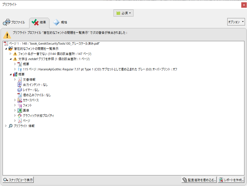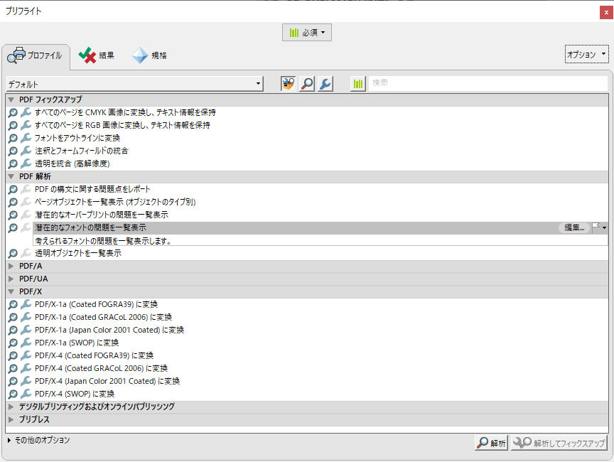 そこで、「PDF解析」>「潜在的なフォントの問題を一覧表示」から解析してみました。