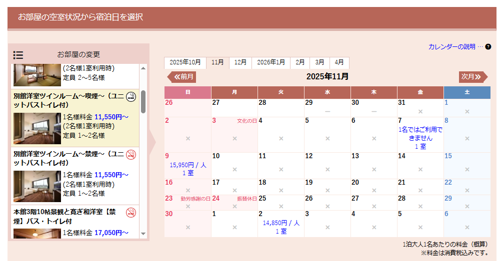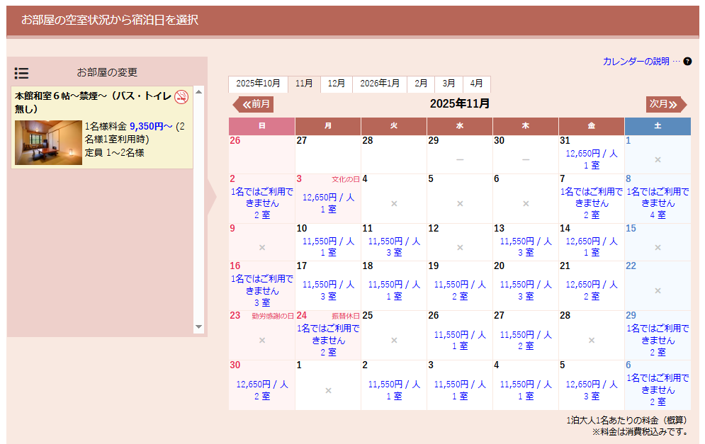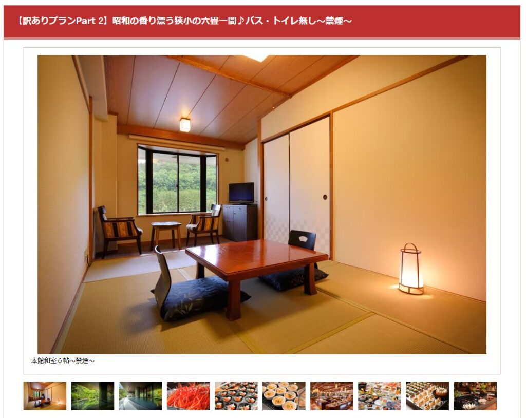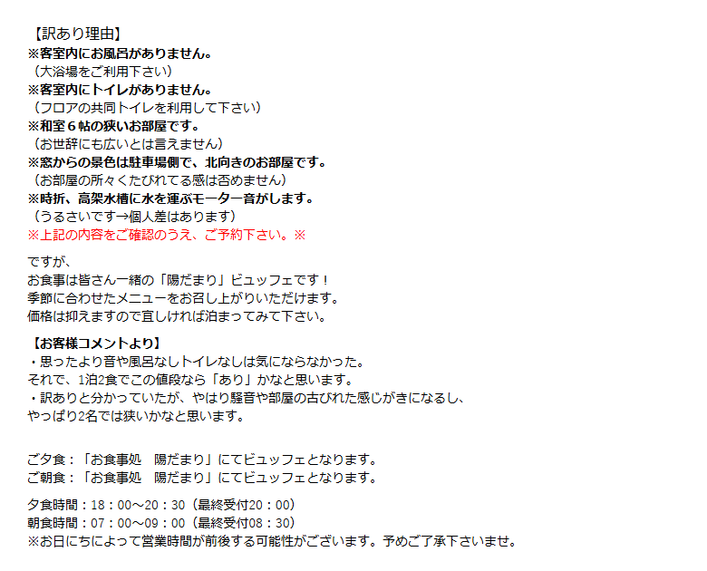 ただ、二人旅であれば一般の部屋にも空きがあることが多く、そもそも「訳ありプラン」を選ぶ必要性自体が下がります。とはいえ、価格を最優先に考えるなら、選択肢として検討する価値はあると思います。
