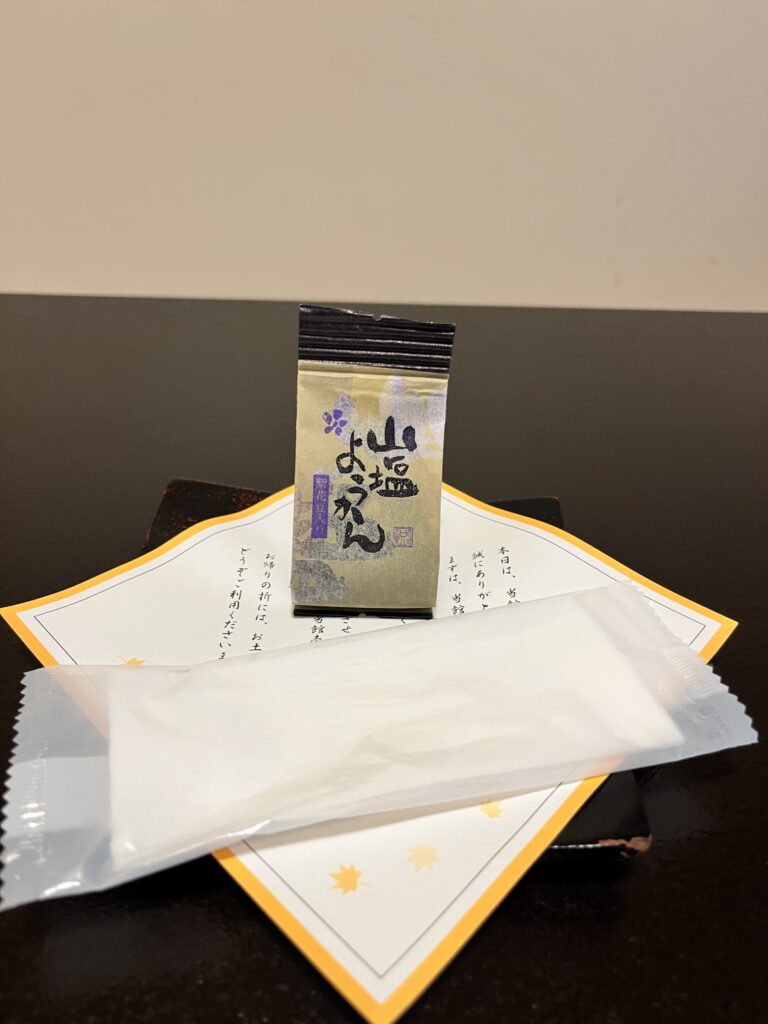 冷蔵庫の中にはミネラルウォーターが1本入っており、テーブルの上には和菓子の「山塩ようかん」が置かれていました。ちょっとした心遣いが嬉しく感じられます。