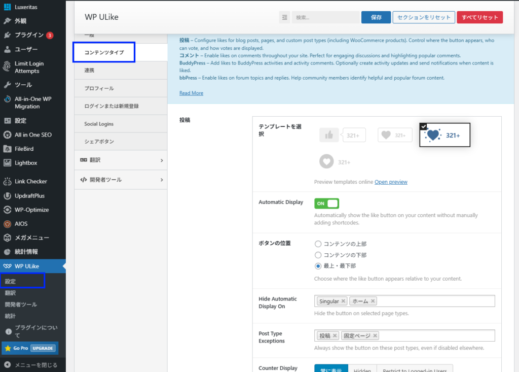 2:左メニューから「WP ULike」>「設定」を選びます。