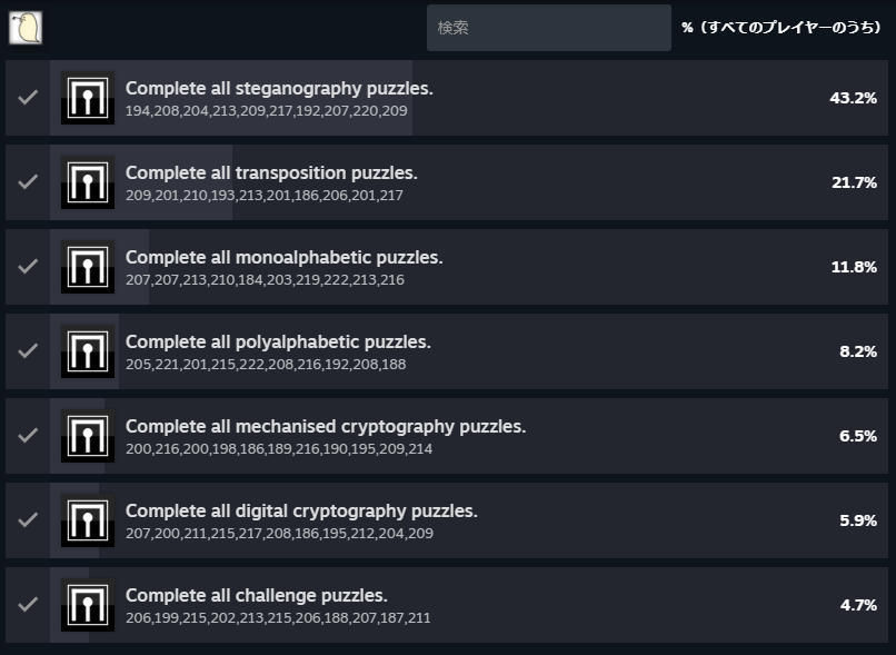 ※ゲームを自然な流れでクリアすると、上記の順に実績解除されていきます(実績達成率の昇順とたまたま同一)。