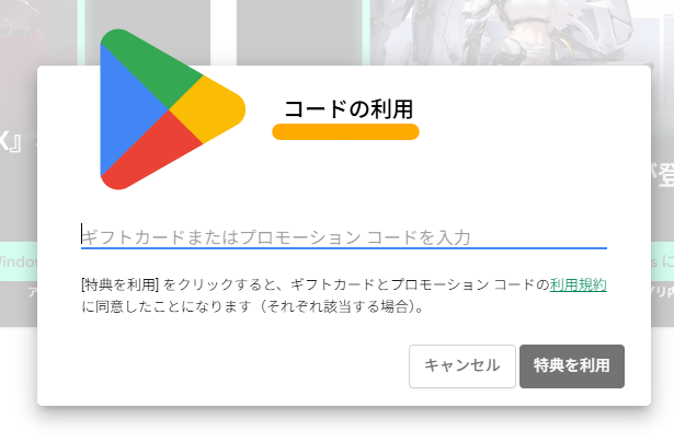 入力欄にギフトカードを入力し、[特典を利用]ボタンを押します。