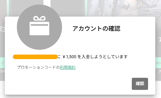 3:「アカウントの確認」ダイアログが表示され、入金先のメールアドレスと金額が表示されます。