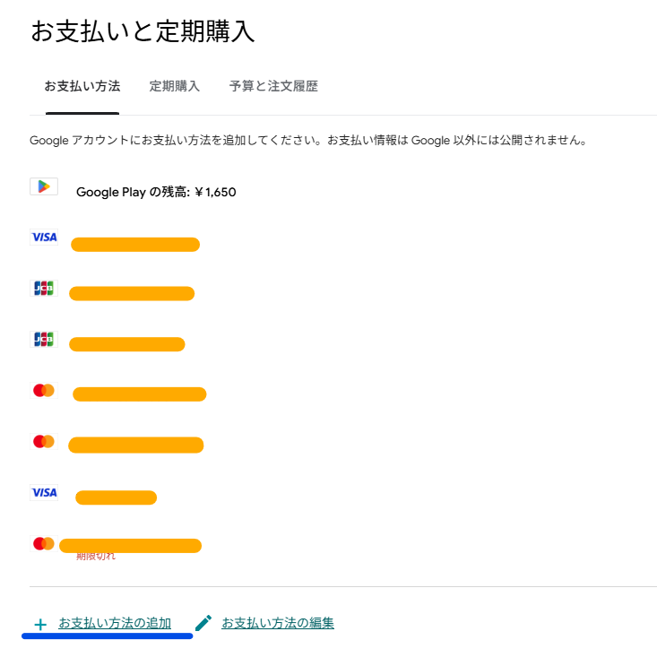 「お支払い方法」タブの下にある「お支払い方法の追加」を押します。
