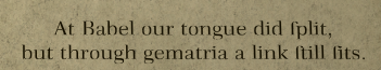 ゲームの詩文の冒頭"At Babel our tongue did split, but through gematria a link still fits."(バベルで我々の言葉は分かれた、しかしゲマトリアを通じて繋がりは今も合う)は、以下のように解釈されます。