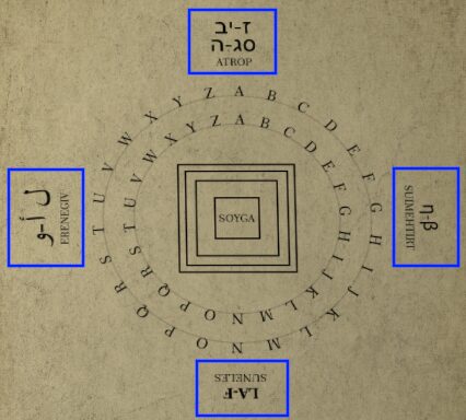 中央にある"SOYGA"は、"The Book of Soyga"という本を指していると推測できます。