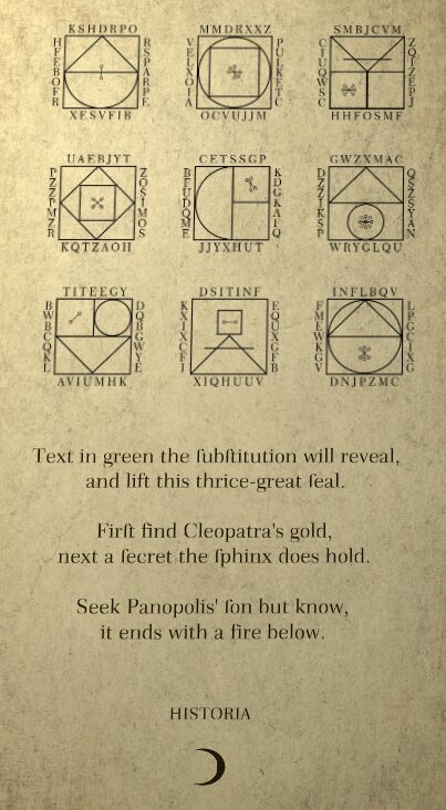 “a secret the sphinx does hold"のヒントから『Atalanta Fugiens』に辿り着くには、錬金術の知識が必要か、または多くの試行錯誤が求められます。