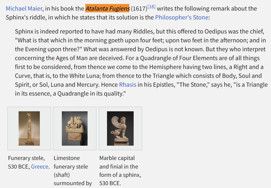 実は、ミヒャエル・マイアー(Michael Maier)著の『Atalanta Fugiens』(逃げるアタランタ) という1617年の錬金術書が関連しています。「Emblem XXXIX」(紋章39番)にスフィンクスの謎かけが登場します。