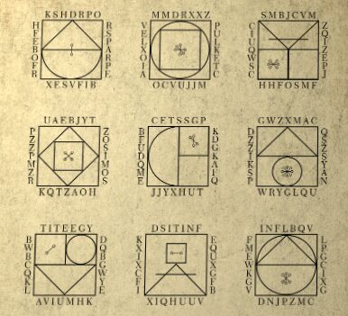 | 4行目 | secret the sphinx holds | Atalanta Fugiens(円+四角+三角) | 左上 |