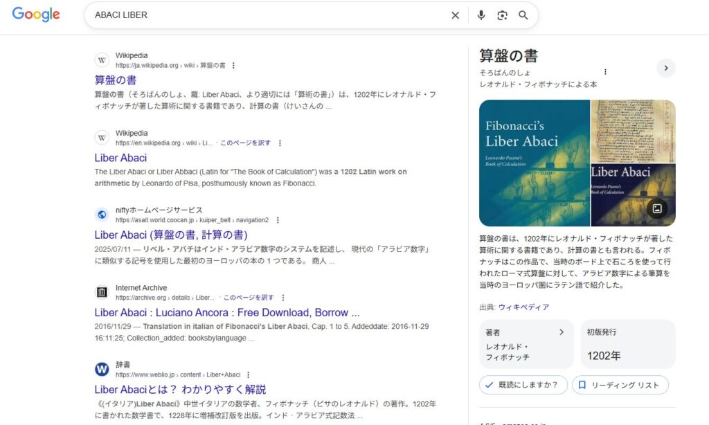 2つの文字列"ABACI"+"LIBER"でGoogle検索すると、"Liber Abaci"(『算盤の書』)がヒットします。