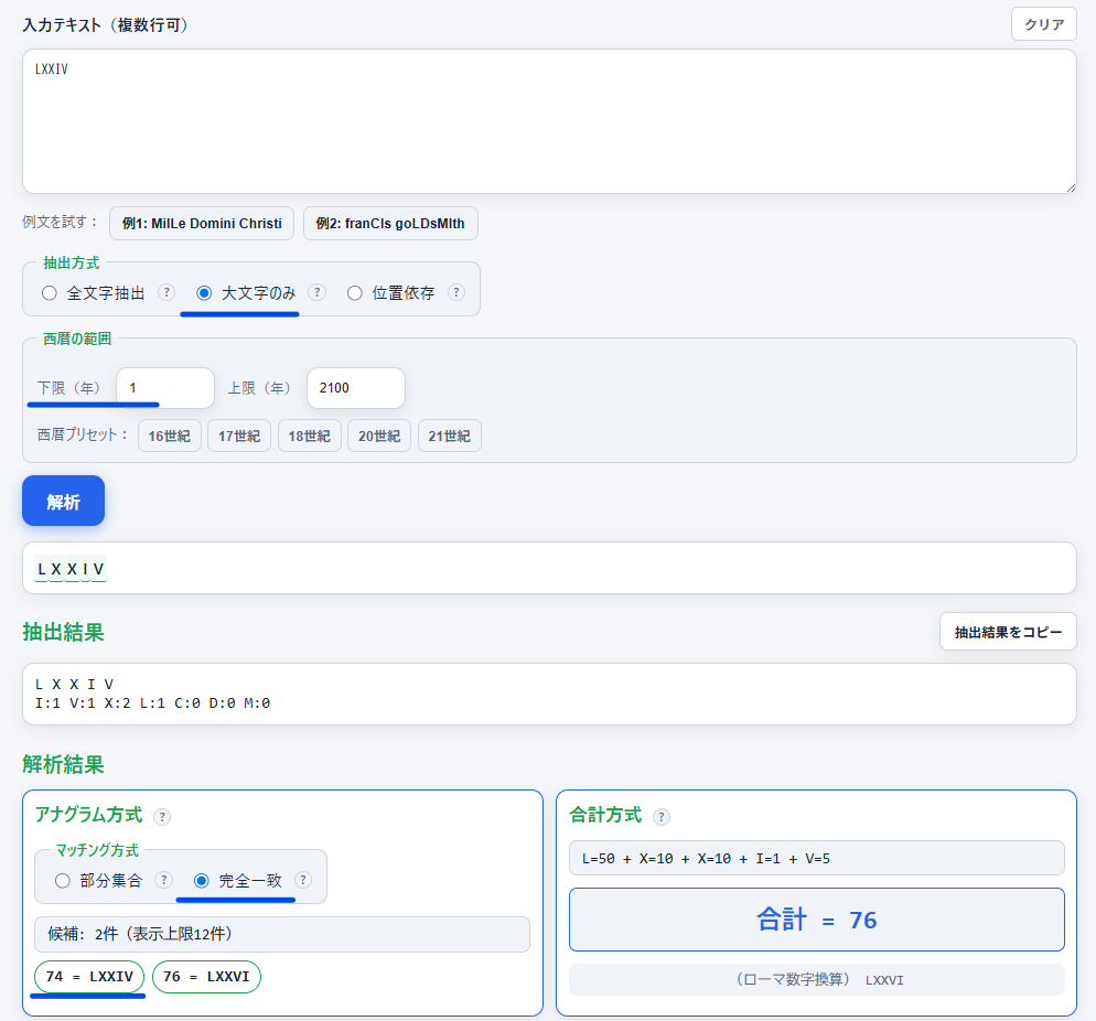 Epigraph Chronogrammerは本来クロノグラムを解読するためのツールですが、ローマ数字に変換するためにも活用できます。
