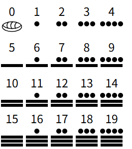 マヤ数字は世界でもっともシンプルな記数法の1つであり、点と横線だけで0-19を表現できます。