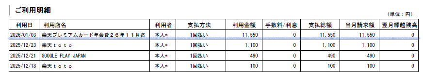 以下は私の例になりますが、1月3日に年会費の支払い履歴が記載されています。