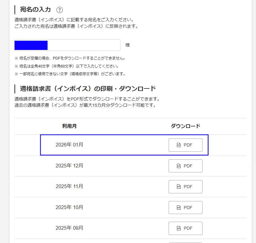 今回は1月が利用日でしたので、その隣の[PDF]ボタンを押します。これで請求書PDFをダウンローできます。