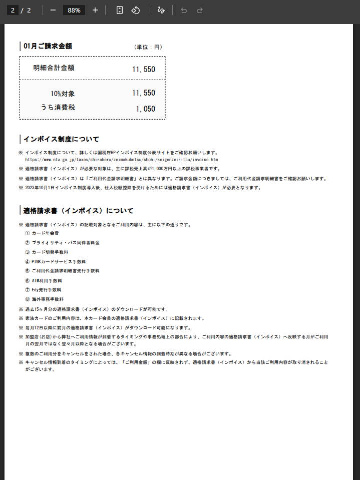 ダウンロードした請求書PDFファイルを開いて、年会費の記載があることを確認にします。