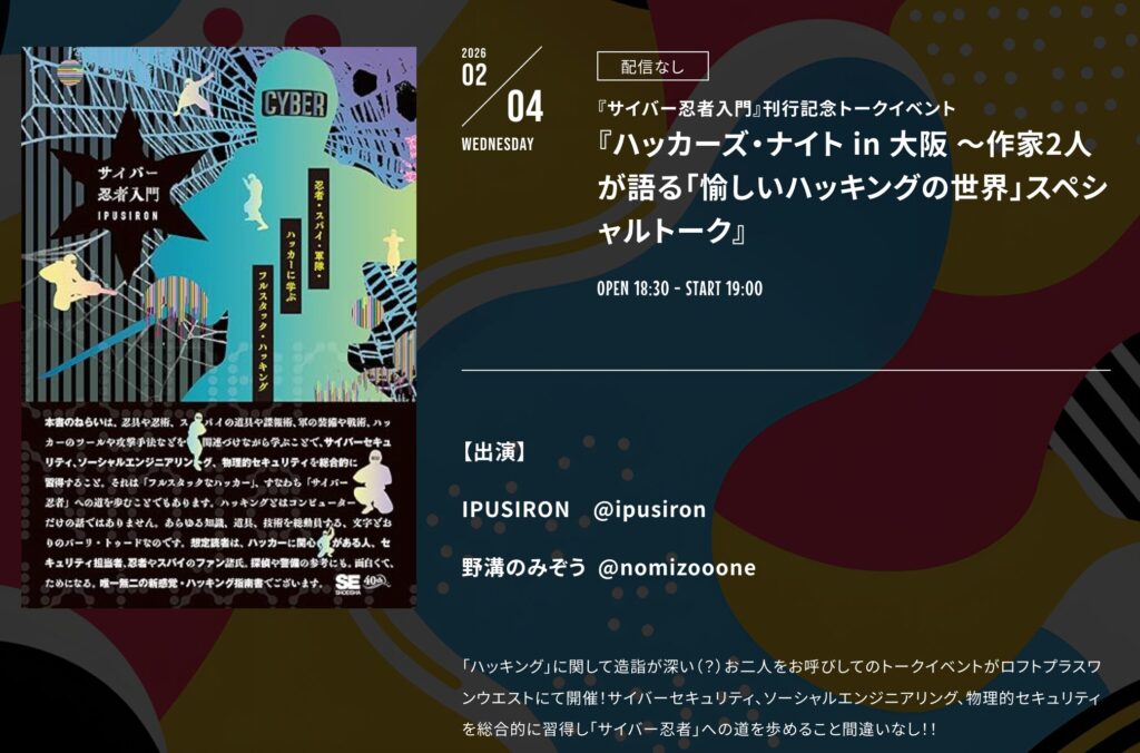 - 【イベント名】『サイバー忍者入門』刊行記念トークイベント『ハッカーズ・ナイト in 大阪 ~作家2人が語る「愉しいハッキングの世界」スペシャルトーク』