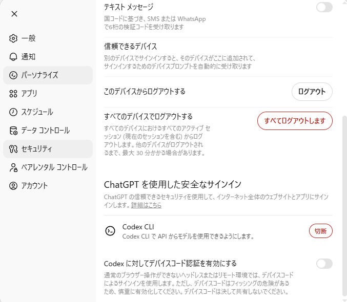 ChatGPTのセキュリティ画面には「Codex に対してデバイスコード認証を有効にする」という項目もあります。画面上の説明は「通常のブラウザー操作ができないヘッドレスまたはリモート環境では、デバイスコードによるサインインを使用します。ただし、デバイスコードはフィッシングの危険があるため、慎重に有効化してください。デバイスコードは決して共有しないでください」となっています。