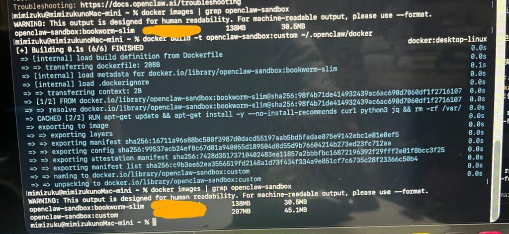 - カスタムイメージの管理:ツールを追加するたびにDockerfileの編集とリビルドが必要になる。sandbox recreate –all の実行後にイメージタグが消える場合もあるため、リビルド後にイメージの存在確認が必要(後述の吹き出し参照)。
