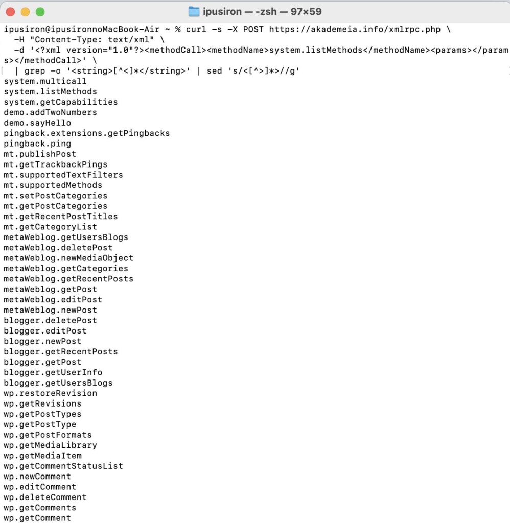 上のコマンドを実行して、system.multicallやpingback.pingなど多数のメソッドが列挙されたなら、これらのメソッドが攻撃に悪用される恐れがあります。