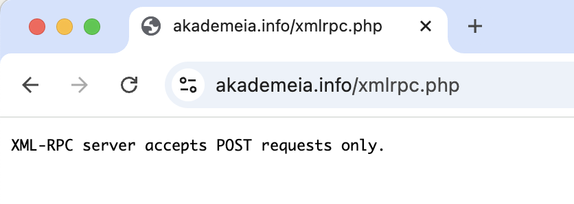 “XML-RPC server accepts POST requests only."が表示されたなら、xmlrpc.phpにアクセス可能、すなわち危険な状態といえます。