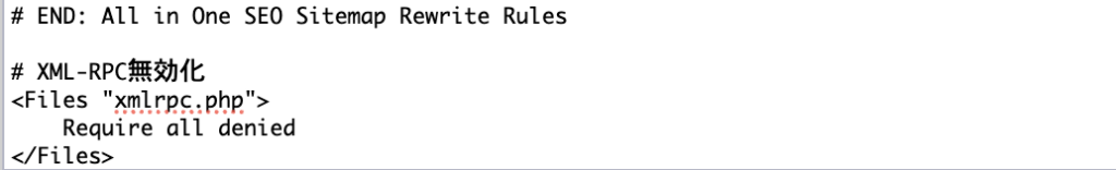 </Files>この設定により、Apacheレベルでxmlrpc.phpへのリクエストをすべて遮断できます。
