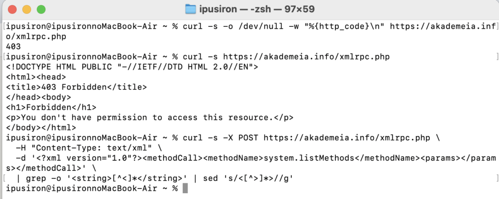 curl -s -o /dev/null -w "%{http_code}\n" -X POST https://yourdomain.com/xmlrpc.php403が返れば対策成功です。