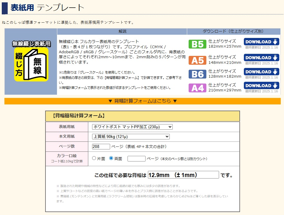 背幅簡易計算フォームで計算したところ、背幅が12.9mm(±1mm)と表示されました(表紙用紙:ホワイトポスト マットPP加工 230μ、本文用紙:上質紙90kg 121μ、ページ数:208P)。
