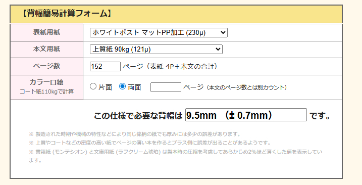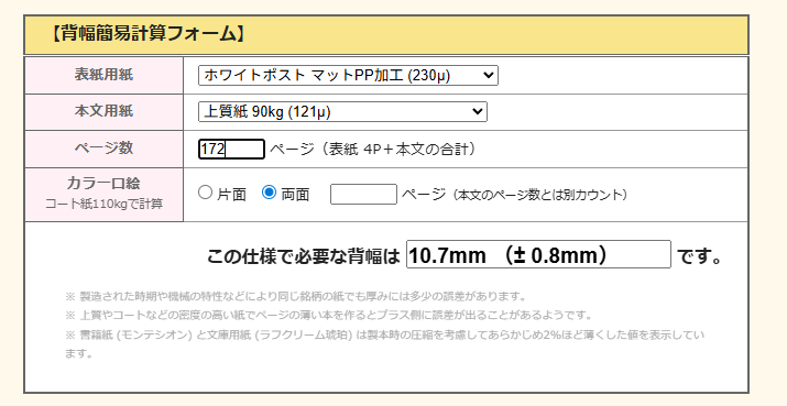 この設定を背幅簡易計算フォームに指定すると、以下のように計算できます。