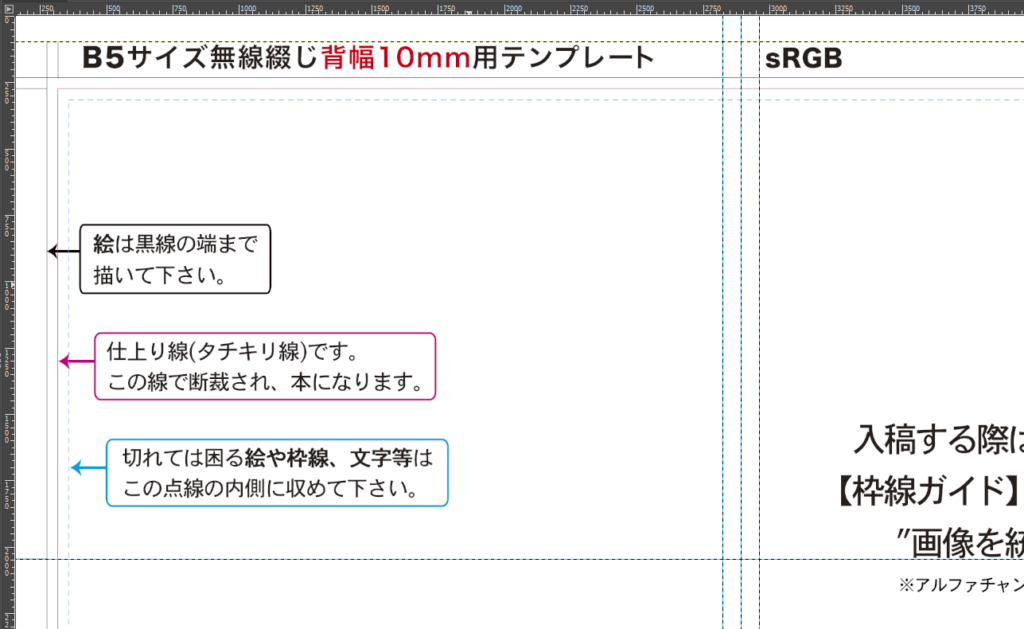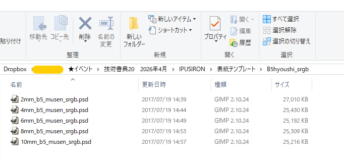 しかし、ダウンロードしたB5のsRGBテンプレート(B5hyoushi_srgb)には2mm〜10mmの5パターンしか同梱されておらず、必要な背幅(14mm)に対応するテンプレートがありません。