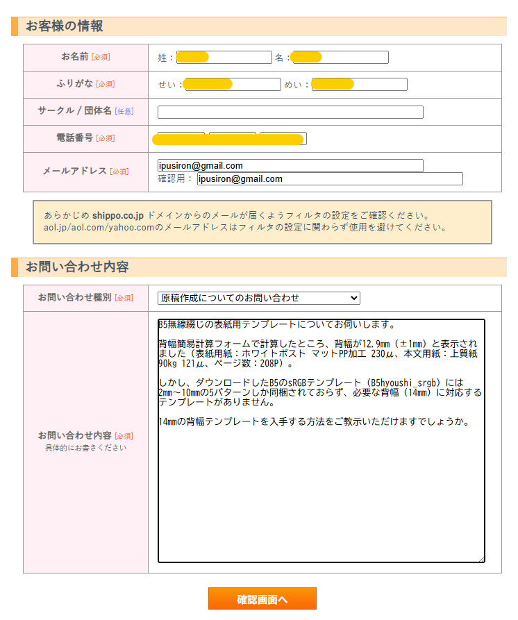 確認後、当日中にメールで表紙用テンプレート("sRGB_B5_14mm.psd"ファイル)が送っていただきました。非常に迅速な対応でした。