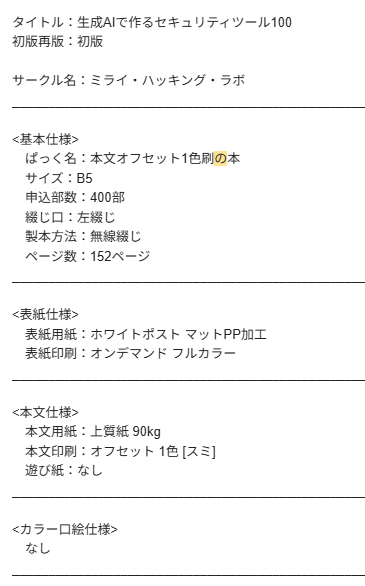 たとえば、技術書典19で頒布した『生成AIで作るセキュリティツール100』(https://akademeia.info/?page_id=44531)は、次の印刷設定で注文しています。