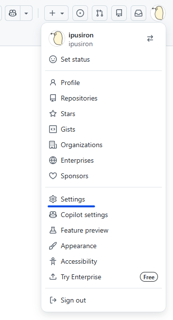 1:GitHubのアイコンを押して、「Settings」を選びます。