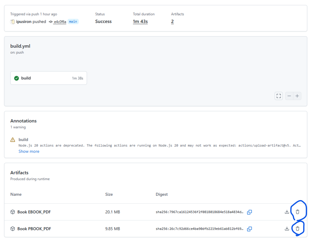 $ gh run list --repo ipusiron/book_ClaudeCodeCryptanalysis --limit 120 --json databaseId -q '.[].databaseId' | xargs -I {} gh api repos/ipusiron/book_ClaudeCodeCryptanalysis/actions/runs/{}/artifacts --jq '.artifacts[].id' | xargs -I {} gh api -X DELETE repos/ipusiron/book_ClaudeCodeCryptanalysis/actions/artifacts/{}注意点
